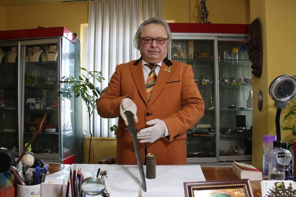 Tokat'ın Erbaa ilçesinde, 27 yıldır tarihi eser toplayan avukat Necdet Dilek'in (59) koleksiyonundaki zümrüt taşa negatif işlenmiş, Büyük İskender motifli altın yüzük ile Tunç Çağı'ndan kaldığı öne sürülen, en eski endüstriyel bakır kılıç dikkat çekiyor.