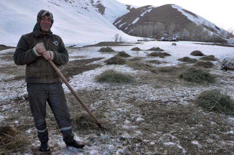 Kadı köyünde yaşayan besiciler, dağlarda ve ovada erimeyen kar nedeniyle hayvanları için köyün dışında oluşturdukları alanlarda biriktirdikleri otu sırtlarında ve branda üzerinde taşıyarak hayvanlarına ulaştırıyor.