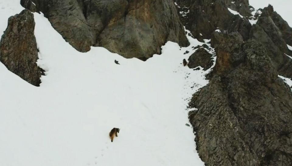 Doğal yaşam alanlarında dolaşan 2 bozayı bölgeye giden dağcılar tarafından dron ile havadan görüntülendi. Bir süre karlı arazide gezinen ayılar, kayalık alana giderek gözlerden kayboldu.