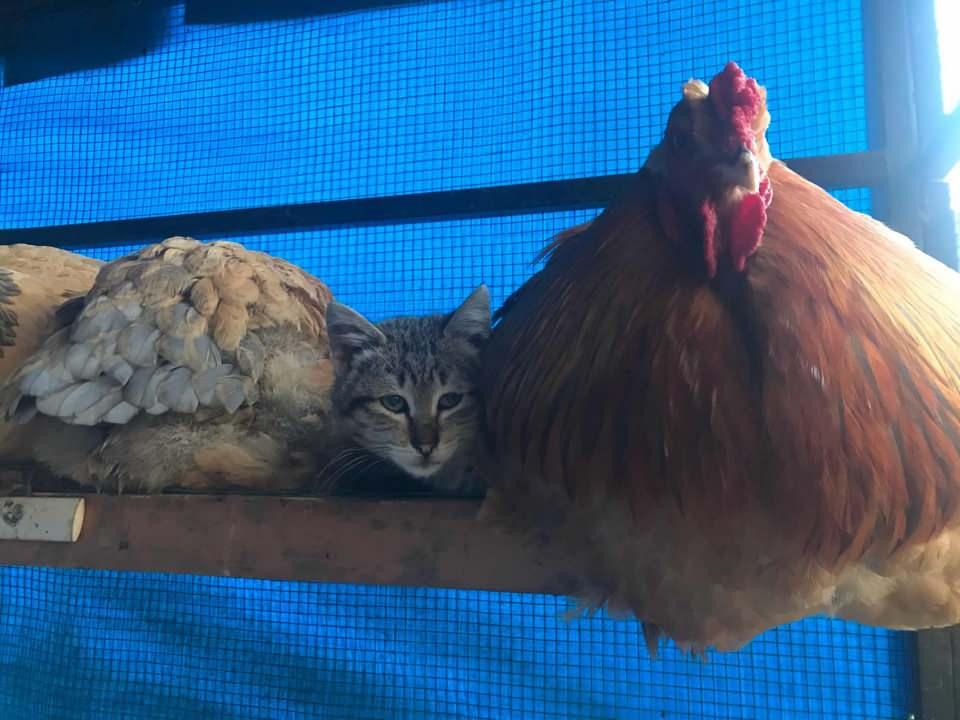 Yavru kedi, horoz ve tavuklarla birlikte kümeste yaşıyor