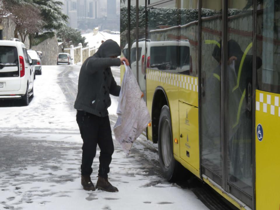 Vatandaşlar otobüsün arka lastiklerinin altına paspas koyarak rampayı çıkmasına yardımcı oldu.