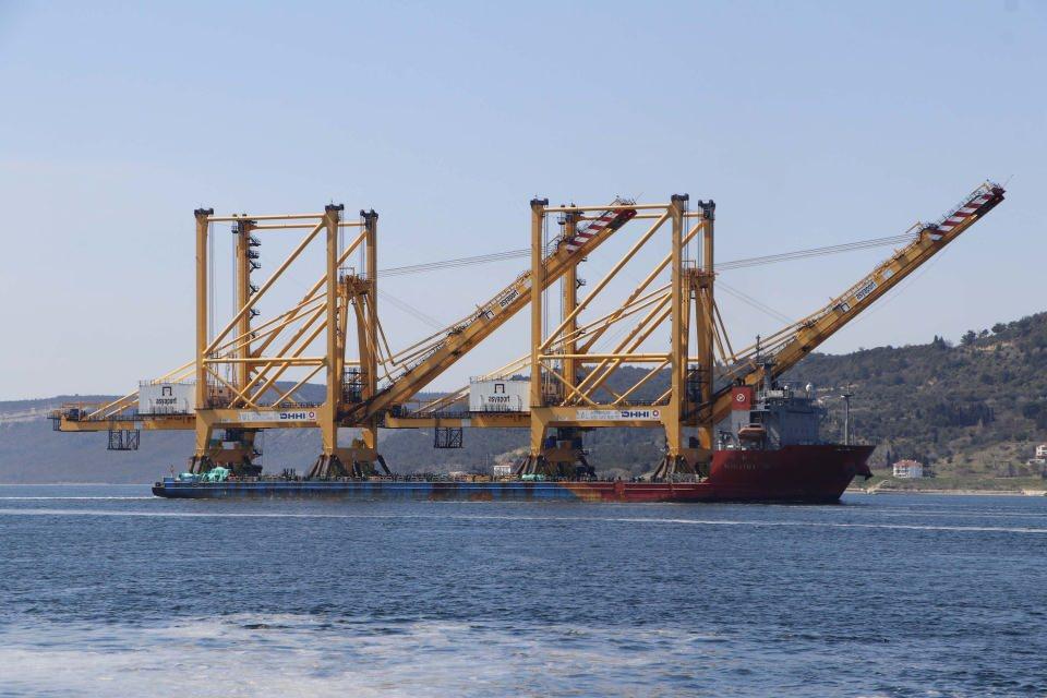 Liman vinci taşıyan dev gemi Çanakkale Boğazı’ndan geçti