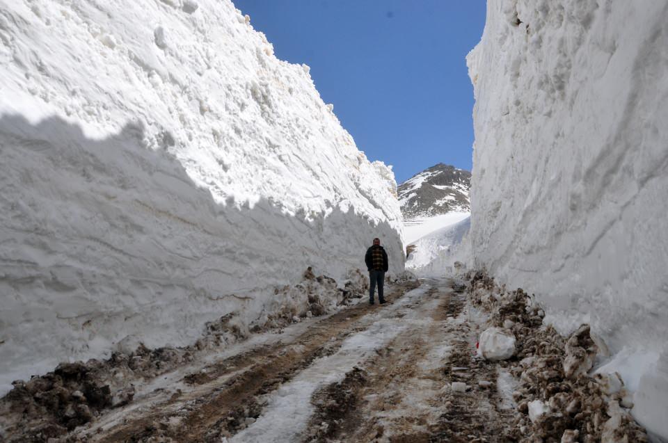 Kepçenin boyunu aşan karda ilerlemekte güçlük çeken ekipler, çığ tehlikesine rağmen çalışmalarına gece gündüz devam ediyor.