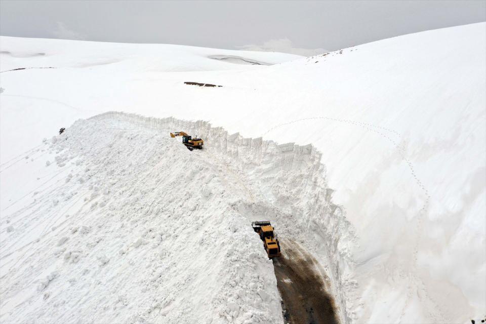 Ekiplerin metrelerce karın bulunduğu bölgedeki çalışması drone ile görüntülendi.