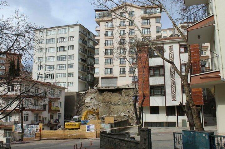 Ankara'da inşaat çalışmaları nedeniyle temelinde kayma olan ve istinat duvarı yıkılan 8 katlı apartmanın yıkım çalışmalarına başlandı.