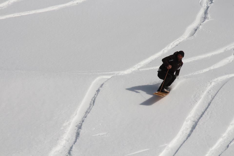 Yıllardır devam eden geleneği yaşatan ve dik yamaçlarda saatte 80 kilometreyi aşan hıza ulaşan tahtalarla kayan köylüler, kısıtlama günlerinde gelen bahar mevsiminde hala karla kaplı doğal pistlerde kayak yapmanın heyecanı yaşıyor.