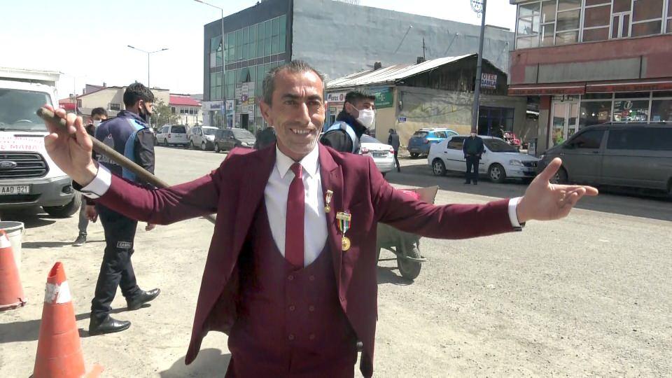 Göle'nin cadde ve sokaklarını 21 yıldır takım elbiseyle temizliyor