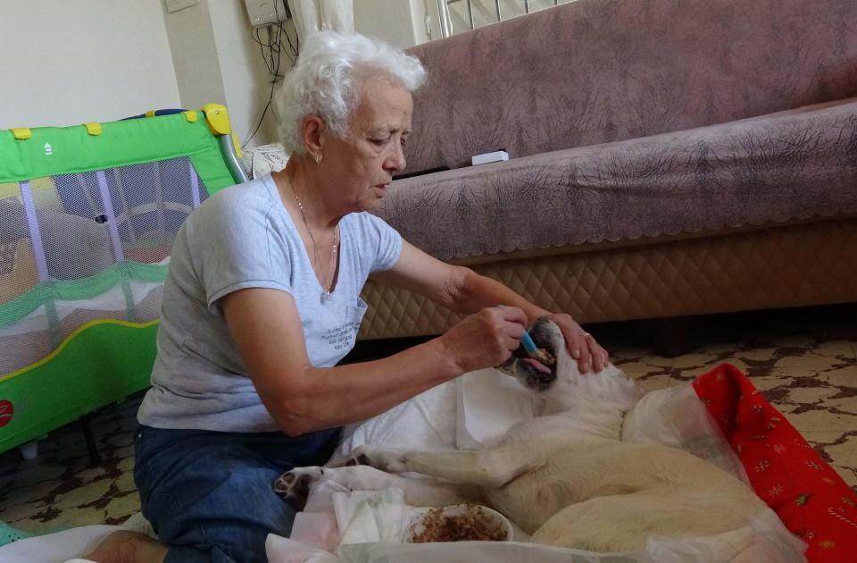 Sağ kalan tek yavru ise, beyin kanaması geçirdi. Sağ tarafı felç olan, yürüyemeyen köpeğin, mamasını kaşıkla yedirip suyunu içiren Tenzule Küçük, hayvanseverin desteğiyle ABD'den yürüteç de getirtti.