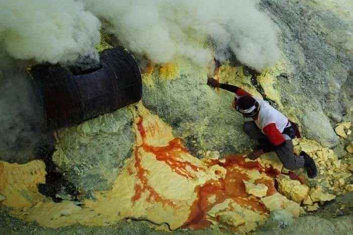 Endonezya'nın Java adasındaki Kawah Ijen volkanik krater gölünde işçiler canları pahasına çalışıyor.