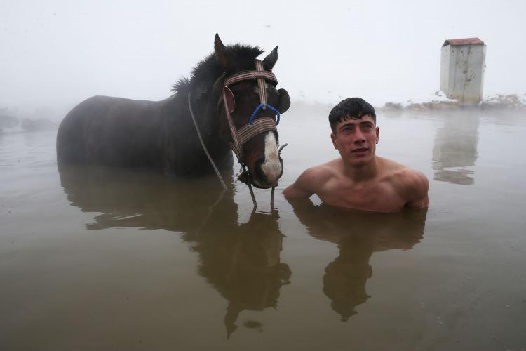 Bitlisli çiftçiler manda ve atlarını dondurucu soğukta kaplıca sularında yıkıyor