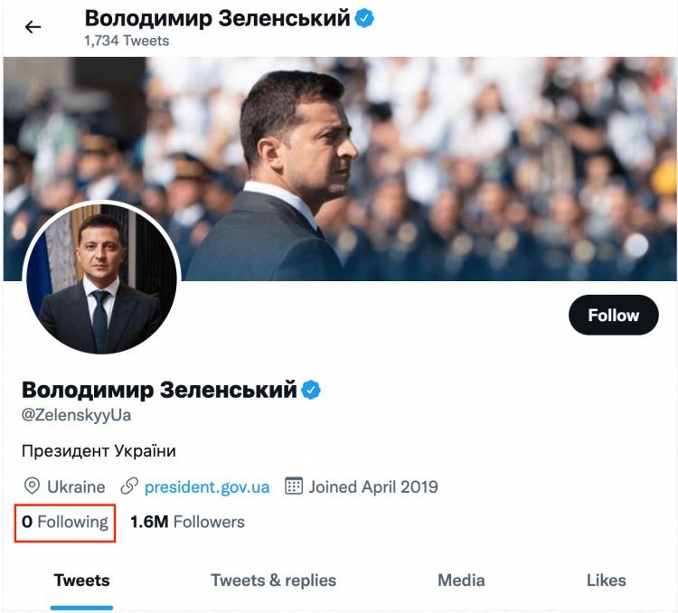 Ukrayna Devlet Başkanı Zelenski’nin Twitter hesabında 26 Şubat tarihi itibariyle kimseyi takip etmediği görülüyor.