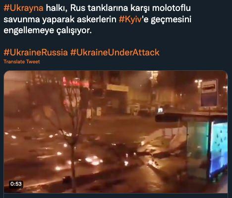 Bu görüntülerden birinin Ukrayna’nın başkenti Kiev sokaklarında ülkesini savunan Ukraynalıların Rus ranklarına molotof kokteyli attığını gösterdiği iddia edildi.