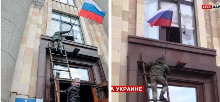 Fotoğrafın Ukrayna'nın Kharkov şehrine 24 Şubat 2022 tarihinde Rus bayrağı çekildiğini gösterdiği iddiası