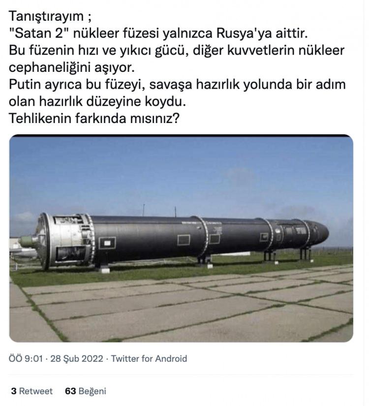 Sosyal medyada ve bazı haber sitelerinde yer alan fotoğrafın Rusya’ya ait Satan 2 nükleer füzesini gösterdiği iddia edildi. Fotoğraf Rusya Ukrayna çatışmalarından önce de dolaşımdaydı.