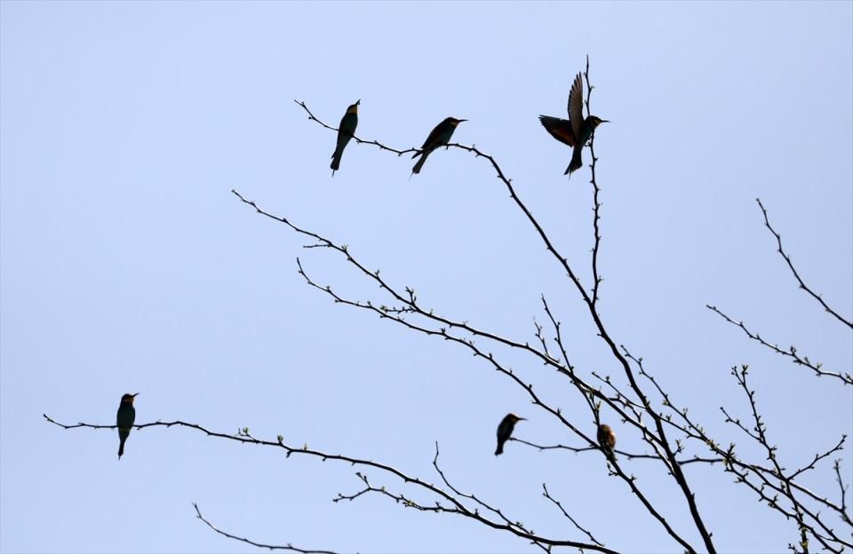 Yuvalarını toprakta açtıkları oyuklara yapan arı kuşları Edirne'de sınır hattında görülüyor