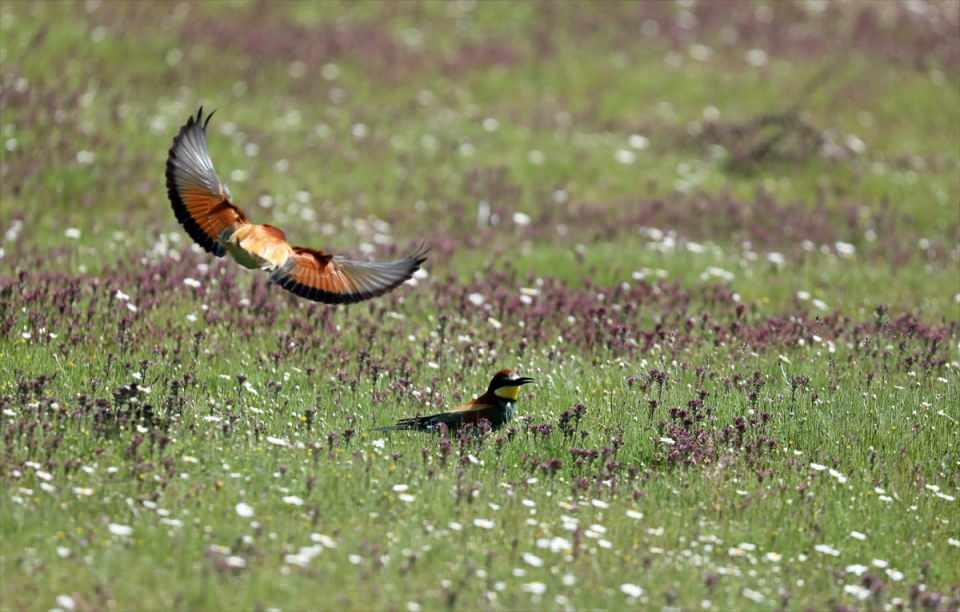 Yuvalarını toprakta açtıkları oyuklara yapan arı kuşları Edirne'de sınır hattında görülüyor