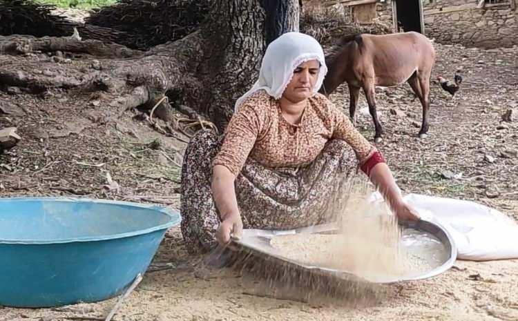 Daha sonra toplanarak atlar vasıtasıyla yapraklarında ayrıştırılan pirinçler ardından su kaynağının yanındaki değirmene getirilerek suyun gücüyle dönen taşla iki aşamada öğütülüyor.