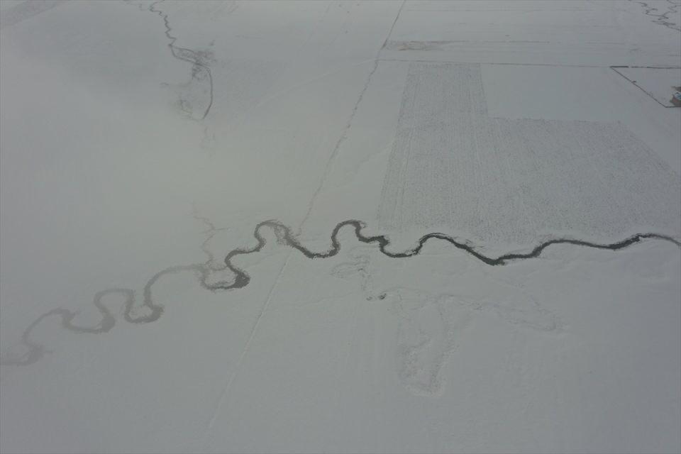 Kars'ta karla kaplı köyler ile menderesler havadan görüntülendi