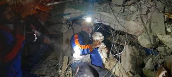 Kahramanmaraş merkezli depremin vurduğu Hatay’ın Antakya ilçesi Akevler Mahallesi'nde yıkılan Dökmeci Apartmanı'nın enkazında kalan ve kabındaki mama ile yaşama tutunan 'Fıstık' isimli köpek, Erzurum AFAD ekiplerince 25'inci günde günde kurtarıldı.