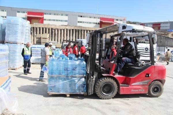 Türkiye'nin dört bir yanından tedarik edilip Hatay'ın çeşitli noktalarına getirilen yüz binlerce litre hazır su, daha sonra forkliftlerle TIR'lara yüklenip kent merkezi ve ilçelerdeki 23 çadır kente, 13 sosyal markete, mobil market araçlarına ve kentteki çadırlarda kalan depremzedelere ulaştırılıyor.
