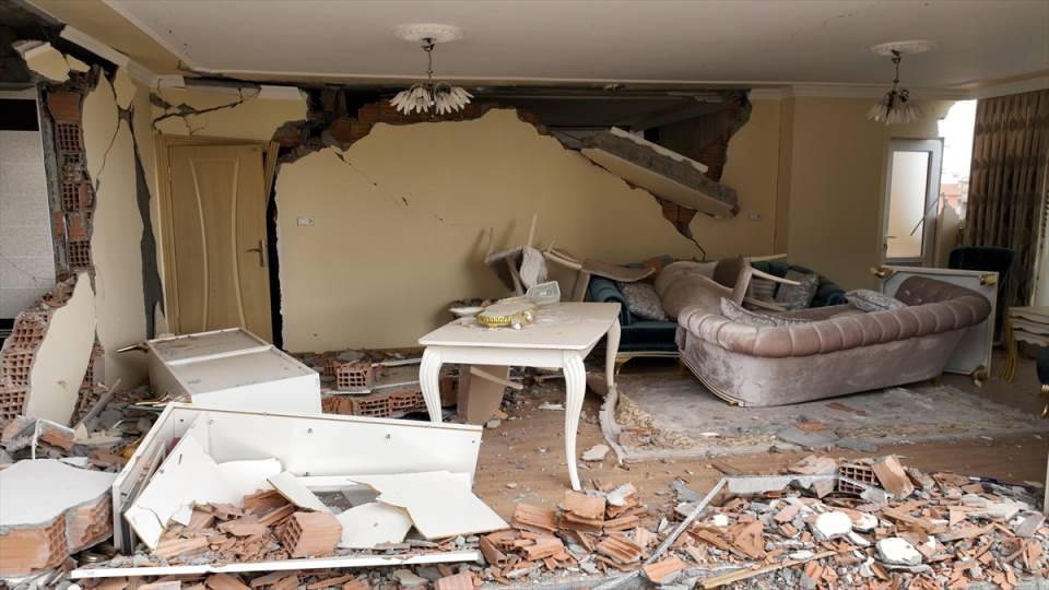 Kolon ve duvarları patlayan, zemine çöken veya yan yatan bu binalardaki evlerin içlerinde de depremin tahribatını gösteren çarpıcı tablolar dikkat çekiyor.