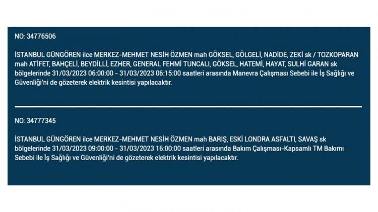 İstanbul'da 31 Mart cuma bu ilçelerde elektrikler kesilecek