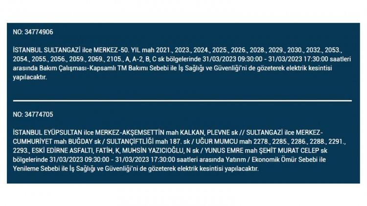 İstanbul'da 31 Mart cuma bu ilçelerde elektrikler kesilecek