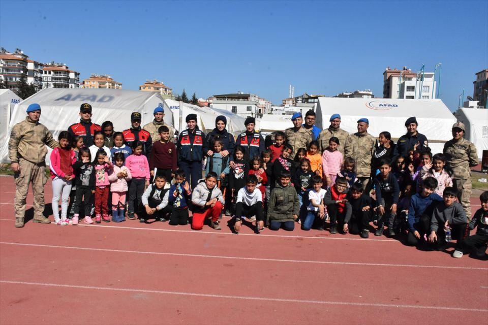 Kahramanmaraş merkezli 6 Şubat'taki depremlerden etkilenen Adıyaman'da görevli jandarma personeli, asayiş ve güvenliğini sağladığı çadır kentte çocuklar başta olmak üzere afetzedelerle yakından ilgileniyor.