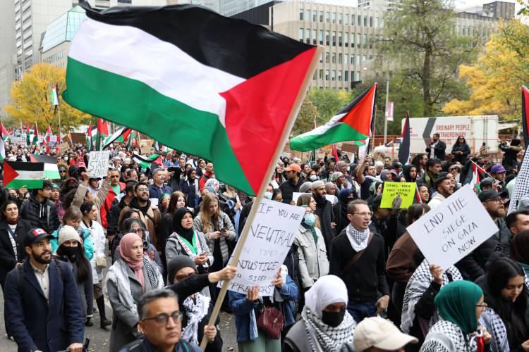 Kanada'nın Toronto kentinde ABD Başkonsolosluğu önünde toplanan çok sayıda kişi, kent merkezine yürüyüş düzenleyerek Filistin'e destek gösterisi yaptı.