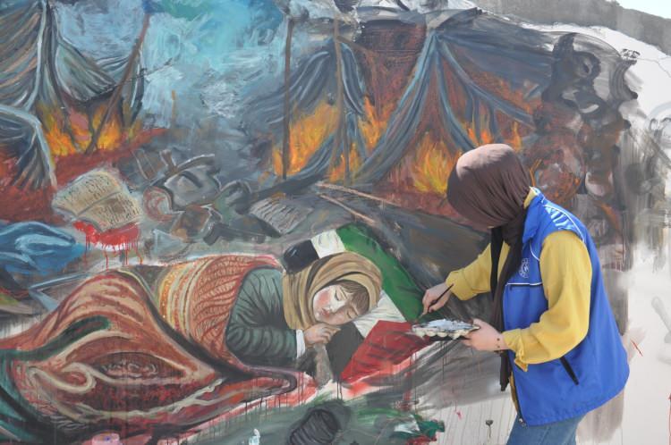 Gazze’de yaşananları depremde hasar gören evin duvarına resmediyor
