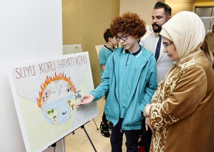 Kum saati metaforuyla doğayı korumak için zamanın azaldığını anlatan resmi yapan 10 yaşındaki öğrenci, Emine Erdoğan’a bir kum saati hediye etti.