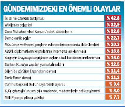 Araştırmaya katılanlar Türkiyenin çözülmesi gereken ilk sorunun yüzde 71.5 ile işsizlik olduğunu belirtti. Çözüm bekleyen ikinci sorun yüzde 51.3 ile PKK/Güneydoğu olurken, üçüncü sırada ise yüzde 40.8 ile eğitim yer aldı.