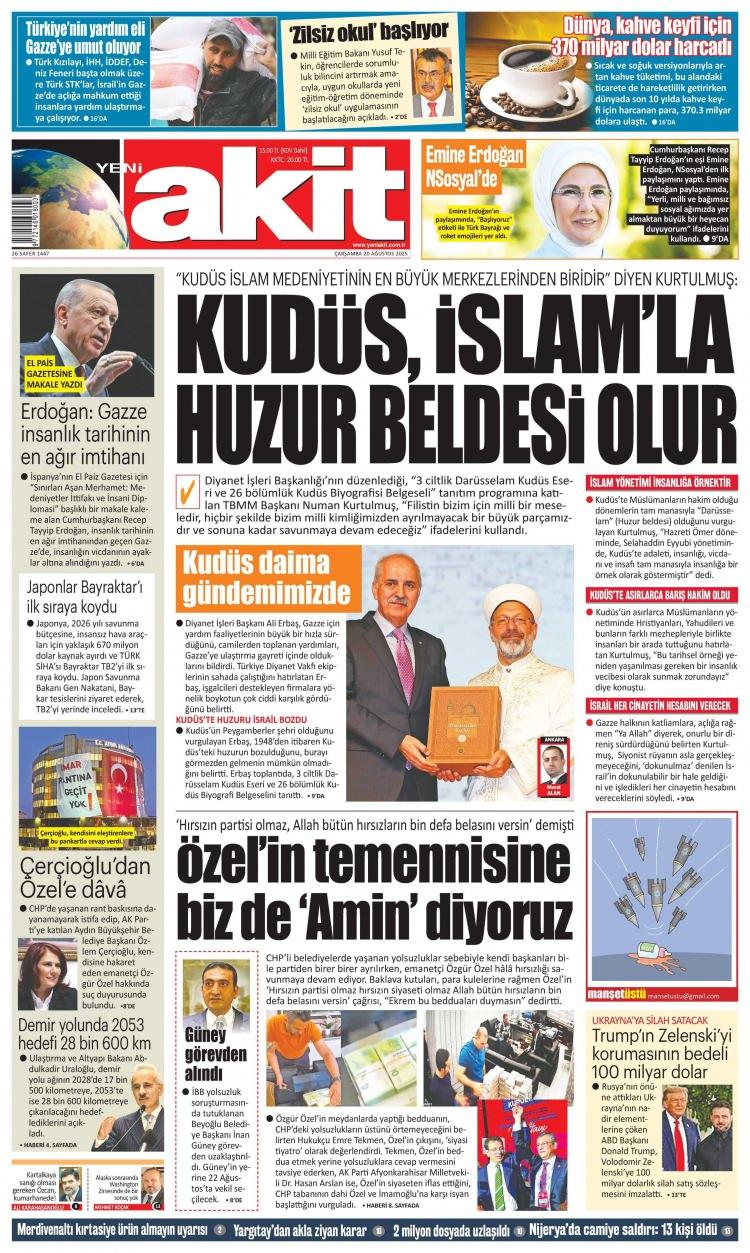 20 Ağustos Çarşamba 2025 Gazete Manşetleri