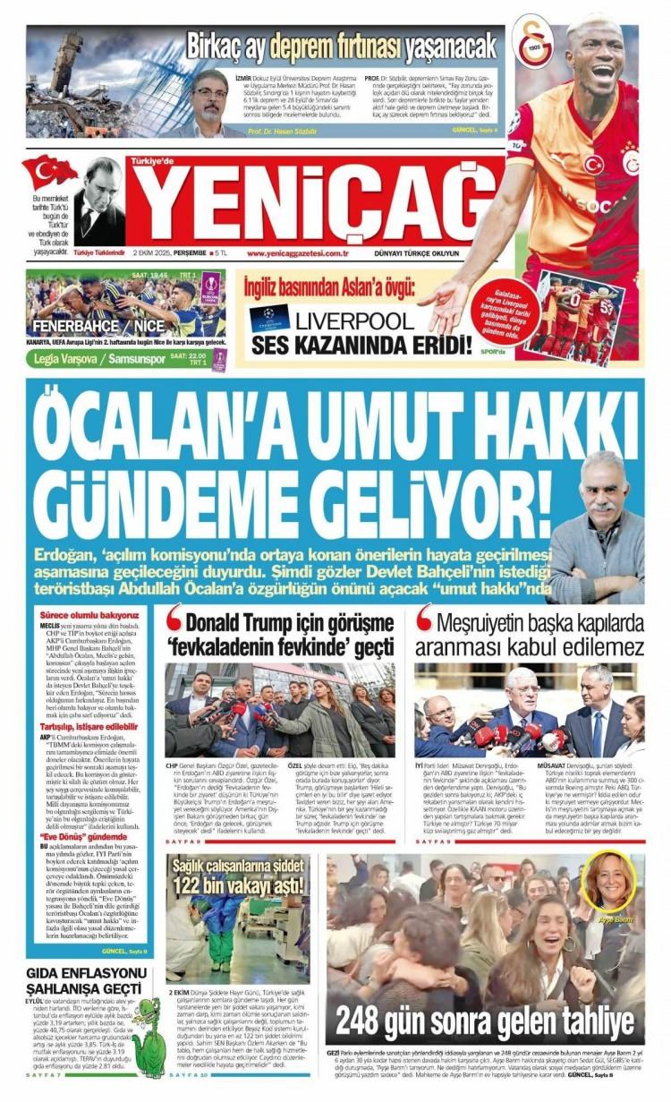 2 Ekim 2025 Perşembe - Gazete manşetleri