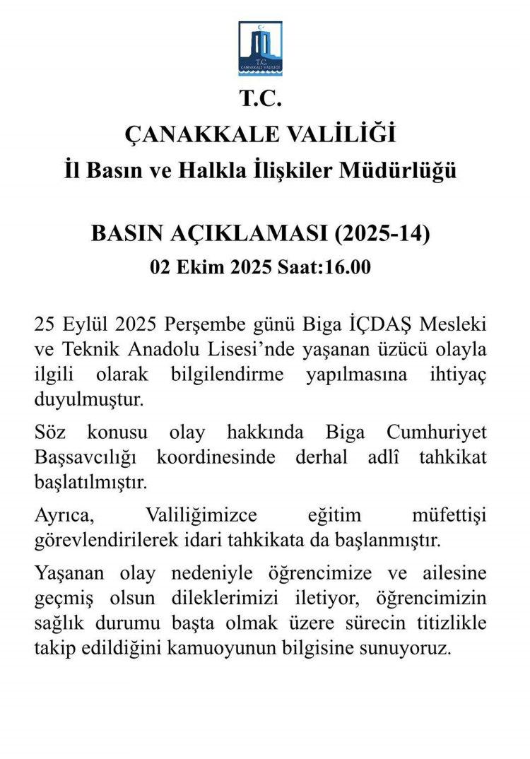 Çanakkale Valiliği, olaya ilişkin açıklama yaptı. Açıklamada, "25 Eylül 2025 Perşembe günü Biga İÇDAŞ Mesleki ve Teknik Anadolu Lisesi'nde yaşanan üzücü olayla ilgili olarak bilgilendirme yapılmasına ihtiyaç duyulmuştur. Söz konusu olay hakkında Biga Cumhuriyet Başsavcılığı koordinesinde derhal adli tahkikat başlatılmıştır. Ayrıca, Valiliğimizce eğitim müfettişi görevlendirilerek idari tahkikata da başlanmıştır. Yaşanan olay nedeniyle öğrencimize ve ailesine geçmiş olsun dileklerimizi iletiyor, öğrencimizin sağlık durumu başta olmak üzere sürecin titizlikle takip edildiğini kamuoyunun bilgisine sunuyoruz" denildi.