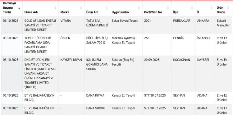 Bakanlık listeyi yayınladı! Adana kebap, sucuk ve pekmezin içinden çıkanlar şoke etti!
