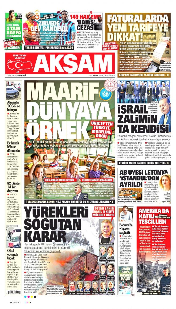 1 Kasım Cumartesi 2025 Gazete Manşetleri