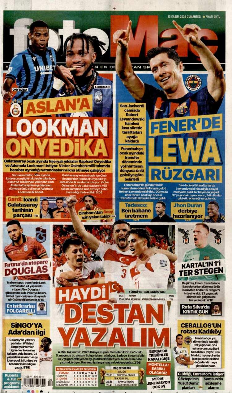 15 Kasım Cumartesi 2025 Gazete Manşetleri