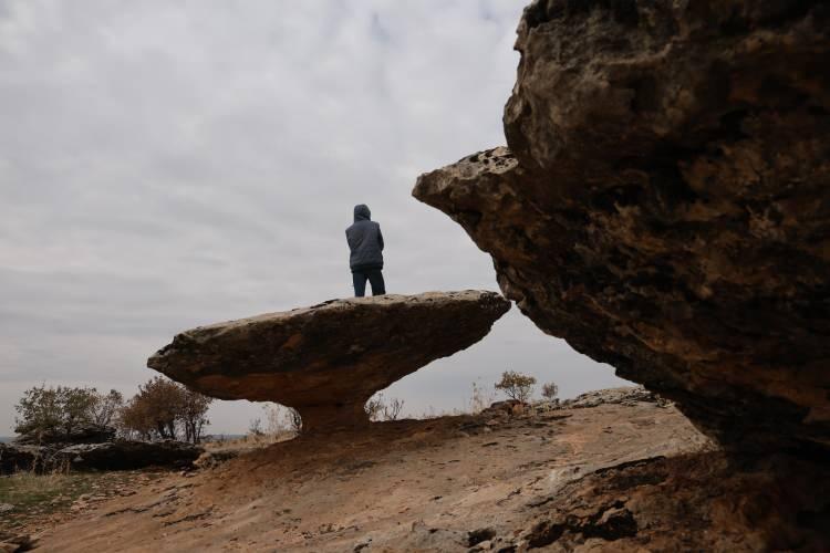 İnce bir sütunla ayakta duran geniş kaya parçası, yıllara meydan okuyor. Antropolog Naci Akdemir, bulunulan yerin sediment tortulu kaya kütlelerinden oluşan bir zemin olduğunu söyledi.