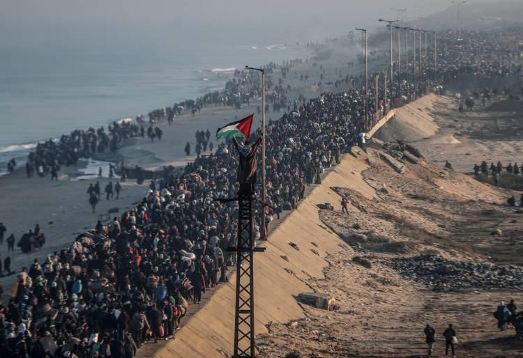 Gazze'de İsrail'in saldırıları nedeniyle zorla yerinden edilen on binlerce Filistinlinin güneyden kuzeydeki topraklarına sahildeki er-Raşid Caddesi üzerinden yayan olarak dönmeye başladı.