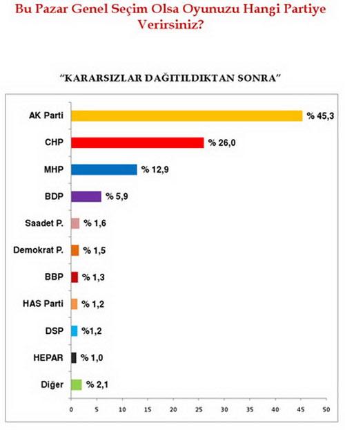 "Bu pazar genel seçim olsa oyunuzu hangi partiye verirsiniz? sorusuna "kararsızlar dağıtılmadan" cevap verenlerin genel anlamdaki dağılımı ise şöyle: AK Parti: 45,3, CHP 26 MHP, 12.9, BDP 5.9, SP 1.6, DP 1.5, BBP 1.3, DSP 1.2 HAS Parti 1.2, Hepar 1, Diğer 2.1...