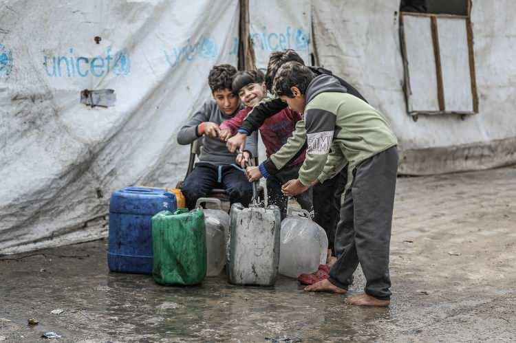 İsrail saldırıları sonucu altyapının ağır hasar gördüğü ve su krizinin yaşandığı Gazze Şeridi’nin orta kesimindeki Nuseyrat Mülteci Kampı’nda yaşayan Filistinliler, su tankerlerinin dağıttığı suları bidonlara doldurarak yaşam alanlarına taşıdı.