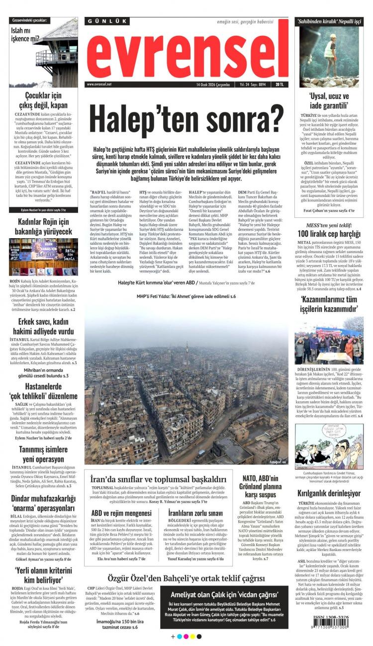 14 Ocak Çarşamba 2026 Gazete Manşetleri