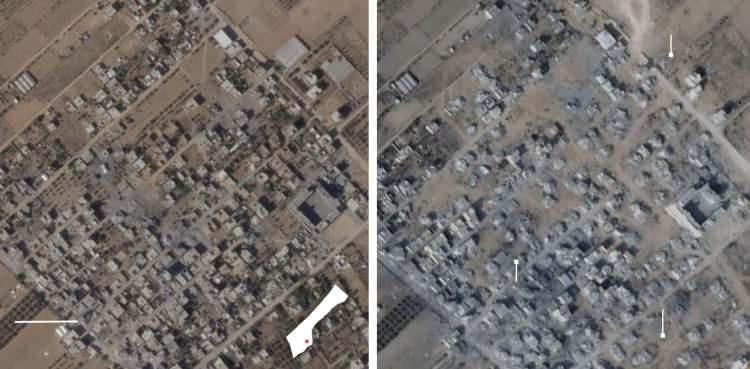 14 Ekim tarihine ait (soldaki) görüntüler ve 5 Kasım tarihine ait uydu görüntüleri (sağdaki) kıyaslandığında, ateşkesin ardından geçen sürede tarım arazilerinin ve seraların yok edildiği görülüyor. (Kaynak: NYT)