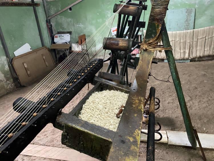 Bugün hâlâ aynı tezgâhın başında olan Şengünalp, üretim sırasında tezgâh üzerinde bulunan 24 kancaya bağlanan ipliklerle saatlerce koşarak çalışıyor. Yaklaşık 700 gram iplik elde edebilmek için günde en az 6 saat boyunca durmaksızın hareket ediyor.