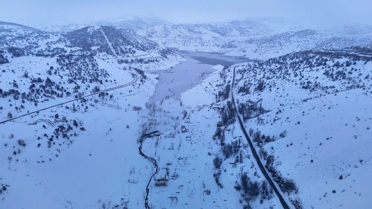 Yaklaşık 16 yıl sonra tamamen ortaya çıkan eski Pusat köyü, bölgede etkili olan yoğun kar yağışı sonrası tamamen kar altında kaldı.