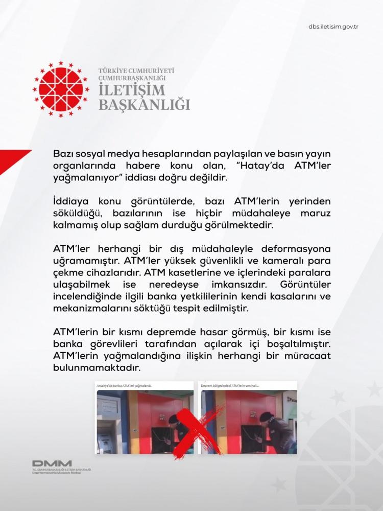 Hatay'da ATM'lerin yağmalandığına dair haberlerin gerçeği yansıtmadığı belirlendi. Görüntülerdeki ATM'lerin bir kısmının deprem nedeniyle hasar gördüğü, bir kısmının ise banka görevlileri tarafından güvenlik amacıyla kasalarının sökülerek boşaltıldığı ortaya çıktı.