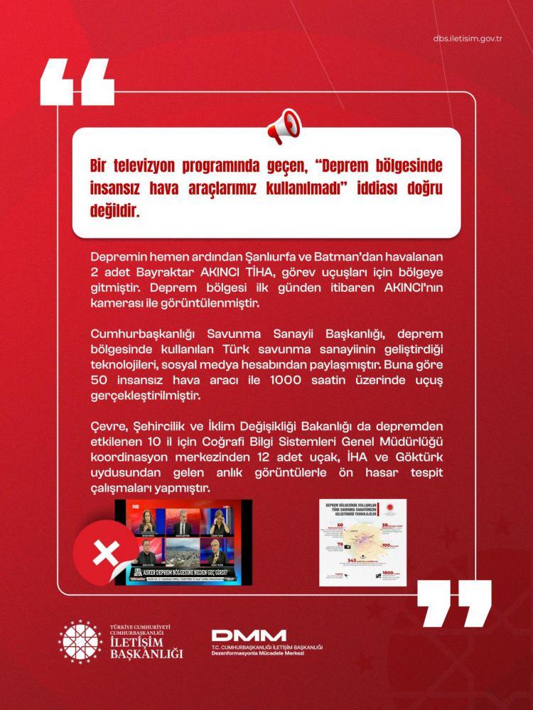 Deprem bölgesinde insansız hava araçlarının kullanılmadığı iddiası resmi uçuş verileriyle yalanlandı. Depremin ilk gününden itibaren Bayraktar AKINCI TİHA dahil olmak üzere 50 insansız hava aracının 1000 saatin üzerinde uçuş yaparak koordinasyon ve hasar tespiti sağladığı açıklandı.