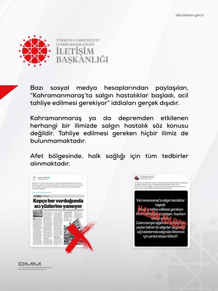 Kahramanmaraş'ta salgın hastalıkların başladığı ve şehrin tahliye edilmesi gerektiği yönündeki iddialar asılsız çıktı. Bölgede halk sağlığı için tüm tedbirlerin alındığı ve tahliye gerektiren bir salgın durumunun bulunmadığı bildirildi. Ayrıca