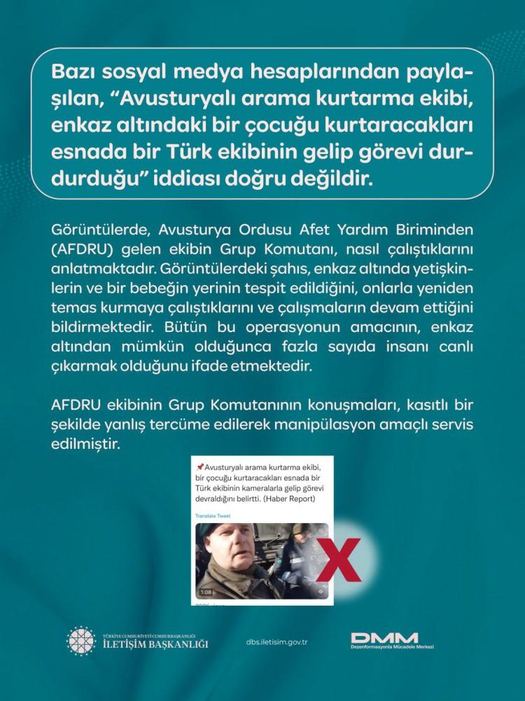 Avusturyalı arama-kurtarma ekibinin çalışmalarının Türk ekiplerince engellendiği iddiasının, bir video görüntüsünün kasıtlı olarak yanlış tercüme edilmesiyle üretildiği tespit edildi. Gerçekte görüntüdeki şahsın sadece çalışma prosedürlerini anlattığı, herhangi bir engellemenin söz konusu olmadığı belirlendi.